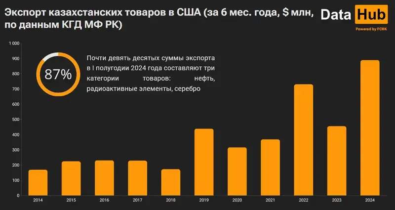 Насколько увеличился экспорт товаров из Казахстана в США в первой половине 2024 года и за счет каких товаров был обеспечен рост – в материале Zakon.kz.