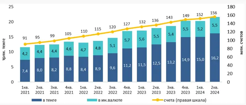 Как отмечают специалисты из Казахстанского фонда гарантирования депозитов, снижение уровня инфляции (с 9,8% в декабре 2023 года до 8,3% в сентябре 2024 года), рост доходов населения и положительная динамика объемов производства поддержали рост депозитного рынка на 6,3% только за одно полугодие, в результате объем депозитов населения приблизился к 22 трлн тенге.