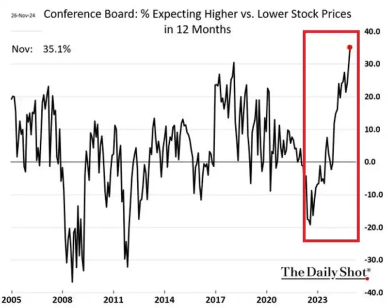 Между тем в самих США финансисты показывают самый оптимистичный настрой в отношении акций с 1987 года. Разница между ожиданиями американцев относительно роста и снижения цен на акции в течение следующих 12 месяцев выросла до 35%. Хорошее настроение американцев стремительно растет, и связано оно с приходом администрации Трампа, который обещает снижение барьеров для бизнеса, отмечают эксперты информационного бюллетеня Daily Shot.