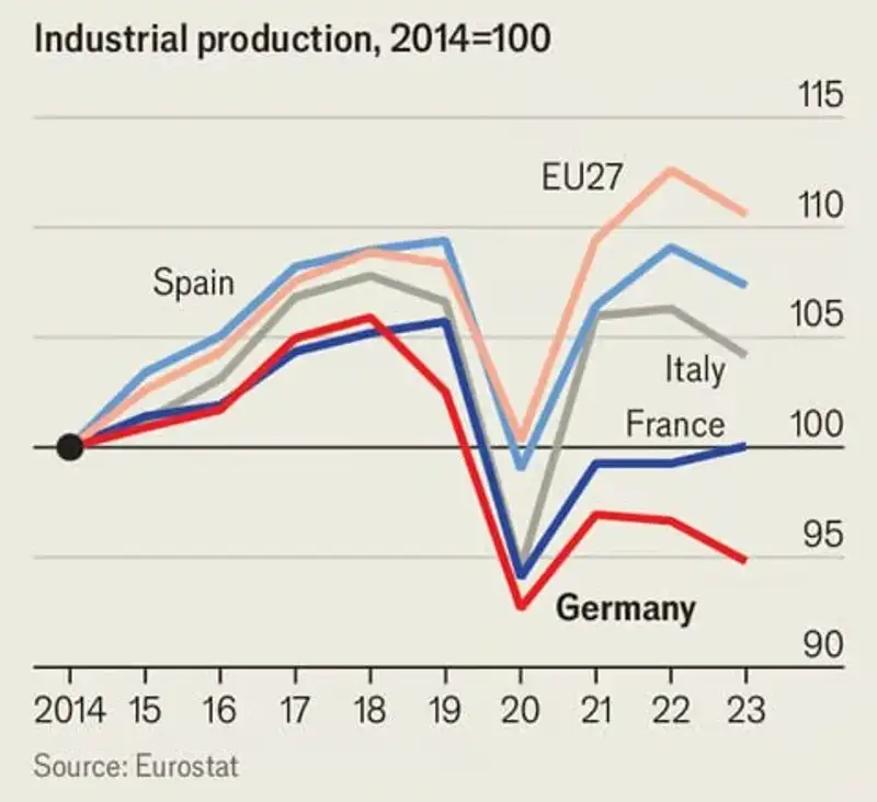 Промышленное производство страны сократилось примерно на 5% за последние десять лет, и восстановления не предвидится. Высокие цены на энергоносители, нехватка рабочей силы и растущая напряженность в отношениях между ЕС и Китаем являются основными причинами кризиса.