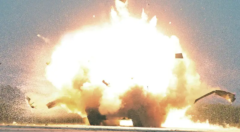 Один из испытываемых беспилотников врезался в цель, напоминающую основной боевой танк Южной Кореи К2, и уничтожил ее.
