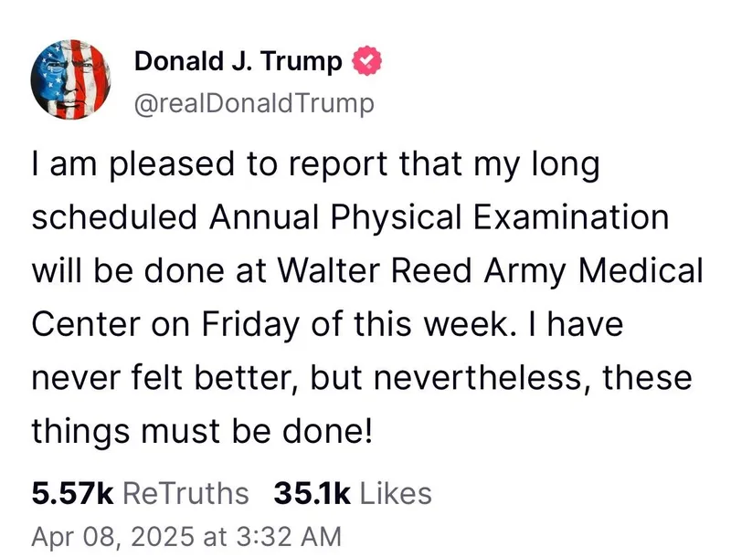 Обход врачей глава Америки запланировал на 11 апреля. Об этом 8 апреля он написал в Truth Social. По словам самого Трампа, он "никогда не чувствовал себя лучше", но подобные осмотры являются обязательными.