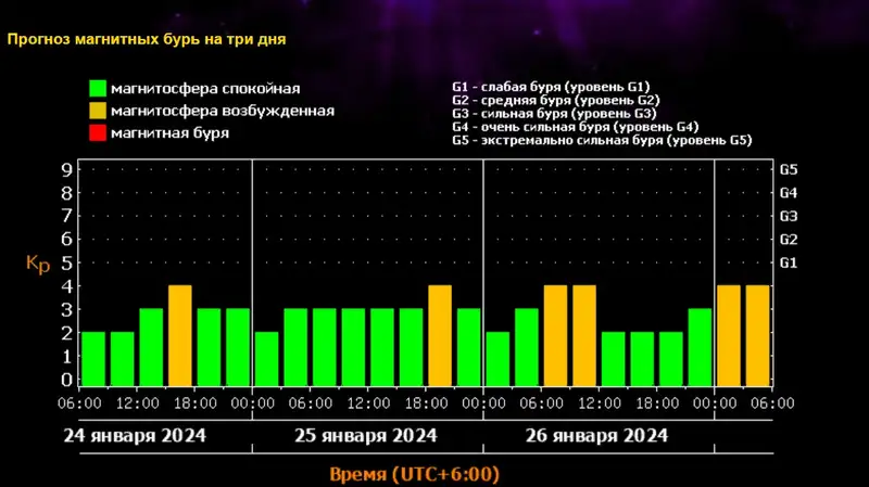Согласно представленному на сайте лаборатории солнечной астрономии Института космических исследований графику, магнитосфера Земли будет неспокойной в 18.00 24 января, затем 25 января в такое же время, а 26 января возмущения достигнут пика к 6.00 мск и спадут после полудня. А уже с 27 января и до 17 февраля включительно магнитосфера будет спокойной.