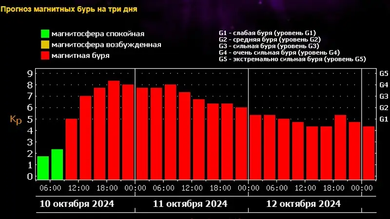 "Магнитные бури ожидаются очень сильными, в пике до класса G4 или даже выше, и продолжительными. Начало возмущений магнитосферы Земли ожидается сегодня, около полудня (ближе к вечеру по казахстанскому времени. – Прим. ред.), и продлятся магнитные бури, с колебаниями интенсивности в диапазоне от средней до очень сильной, G2-G4, до конца суток пятницы, 11 октября. В субботу магнитные бури продолжатся, но уже менее интенсивными, слабого и среднего уровня, классов G1-2G. И только в воскресенье возмущения геомагнитного поля будут ослабевать и прекращаться", – указал Леус.