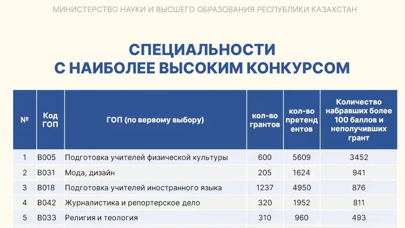 В министерстве озвучили специальности с наиболее высоким конкурсом. Так, на первом месте оказалась специальность по подготовке учителей физической культуры. Количество претендентов составляет 5609 человек на 600 грантов.