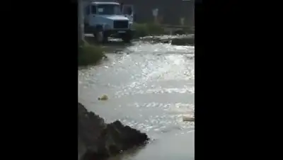 Видео с текущей по улицам водой и практически смытым мостом прислали жители отделения Кирова в Шымкенте, пишет TVK.