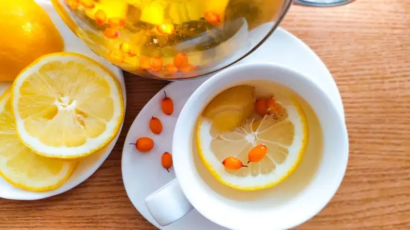 На дно чайника выложите ягоды облепихи. Корень имбиря (небольшой кусочек) мелко порубить или натереть. Залить кипятком, добавить дольки лимона, палочки корицы и звездочки бадьяна. Когда чай настоится, необходимо подавить дольки лимона, чтобы выделился сок. Добавьте ложку натурального меда, перемешайте и наливайте горячим через ситечко.