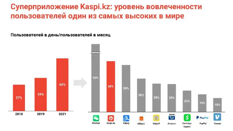 Суперприложением Kaspi.kz пользуются уже более 11 млн человек. Из них 6,5 млн заходят в приложение ежедневно. То есть, из десяти человек шестеро используют мобильные сервисы Kaspi.kz ежедневно. Уровень вовлеченности составляет 60%, и это один из самых высоких показателей в мире.